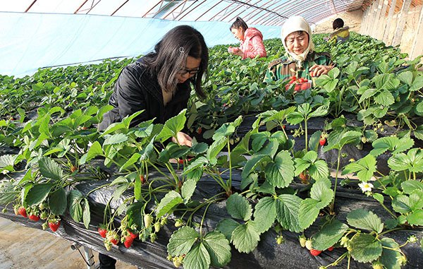新疆哈密市恒顺特色农业种植基地几位工作人员在采摘草莓。