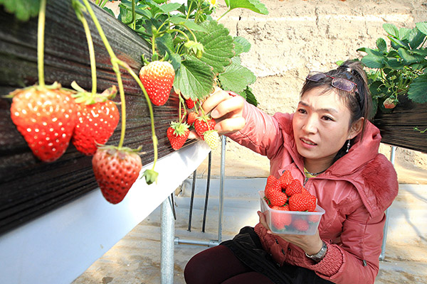 近日,新疆哈密市恒顺特色农业种植基地引进的韩国高架草莓陆续成熟上市。该园区引进韩国高架草莓无土栽培技术,以椰树壳为种植原料,采用蜜蜂授粉、生物有机肥和配方施肥等无公害生产技术,草莓产量是普通种植草莓的三倍,成为当地农业增收新亮点。