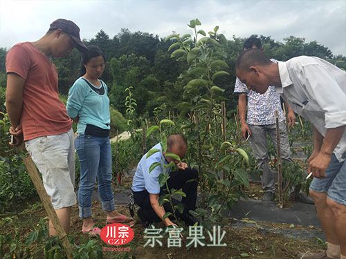 2016年7月31日,具有15年梨树种植经验的“宗富果业”副理事长郑总亲自下地指导黄金梨苗修枝整形工作。