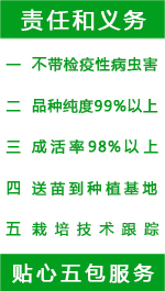 宗富果业从1986年创业至今,所供的各种果苗均保证:采用丰产挂果树穗条,嫁接于抗逆性强的砧木;无检疫性病虫害;品种纯度99%以上;成活率98%以上;同时提供省力高效栽培新技术等服务。品种纯度是基础,果苗质量也重要,技术要领关键,故选择比努力更重要!宗富果业专注果业30年,一直遥遥领先于国内同行!宗富荣誉凝聚着汗水与心血,融入着责任和担当!诚信.责任.专业是我们永恒不变的动力和发展方向!欢迎社会各界人士积极关注、监督我单位开展的果品配送、果苗供应和果技服务工作!