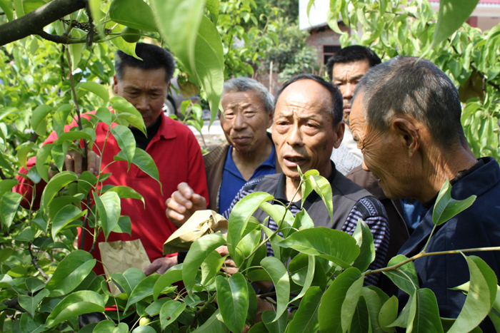 理事长裴忠富与李远华老师为种植户讲解套袋技术并现场示范
