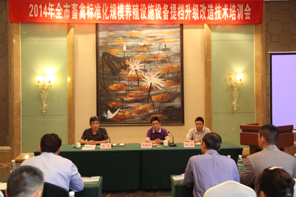 2014年7月11日,市农委在新津县组织召开了2014年全市畜禽标准化规模养殖场设施设备提档升级改造技术培训会。市农委副主任李晓东,畜牧兽医处、市动物疫病预防控制中心相关人员,相关区(市)县农发(畜牧)局分管副局长、畜牧科(站)长和参加提档升级改造的养殖企业负责人共计130余人参加了培训会。会议安排部署了2014年畜禽标准化规模养殖设施设备提档升级相关工作及有关要求,并就2014年成都市生猪标准化规模养殖场、种公猪站、种鸡场设施设备提档升级改造项目的具体内容及评分标准进行了技术培训。