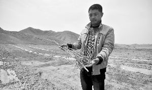 “这就是被破坏的文冠果幼苗。”陈先生捡起被丢弃在地上的苗木告诉记者,2009年,为了响应国家政策,绿化环境和维护生态平衡,他和朋友在永登县的招商引资项目中承包了这片林地。当时,这块土地是附近村民的撂荒地,由于干旱,加上没有水源,这里的土地基本没有耕种,他和朋友想,与其这样荒废,还不如用来绿化,搞一些有利于附近村民的生态建设,于是,他们通过村委会签订承包合同,给村民发放一些补助,便开始了开发利用。经过几年的筹备和开发,他们从10公里以外的地方拉运水、修路,终于在这里建成了初具规模的万亩文冠果基地。然而,令他们没想到的是,5月22日下午,一些不明身份的人出现在种植基地的地头,他们不听任何劝阻,就在地里乱拔、乱丢,导致2万余株文冠果苗毁于一旦。“他们拔掉的不仅是树苗,更是我们建设林地的信心。”陈先生指着满地狼藉的林地心疼地说。