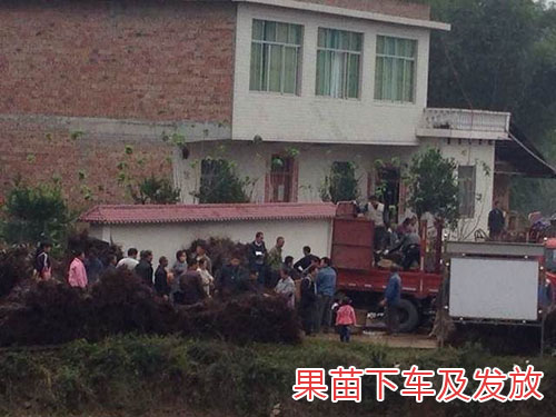 四川省雅安市宝兴在对我单位充分考查、核实、论证后定购圆黄梨树苗50000株,图片为:我单位人员在下车及发放果苗