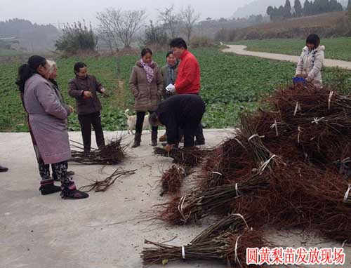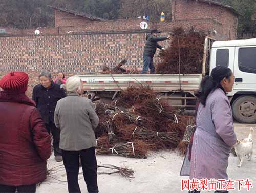四川省金堂县土桥镇对我单位充分考查、核实、论证后定购23600株圆黄梨苗。此图:圆黄梨苗下车及发放现场